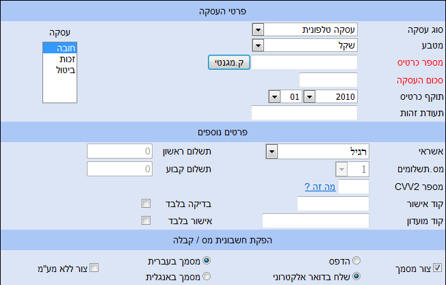 חיוב כרטיסי האשראי דרך האינטרנט באמצעות דף אינטרנט ו/או ע"י התקנת תוכנה מקומית בבית העסק. פעולת חיוב כרטיס האשראי קלה ומהירה, ניתן לחייב את כל כרטיסי האשראי בכל רגע נתון על ידי העברת הכרטיס בקורא כרטיסים (שפתיים) או הזנת מספר הכרטיס דרך המקלדת, האישור לעסקה מתקבל מיידית ובזמן אמת.